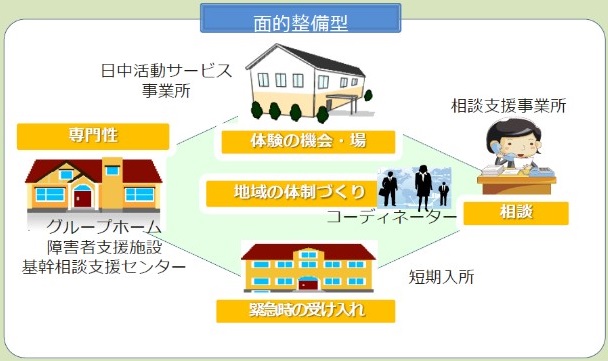 人吉球磨地域は10市町村で構成されており、障がいのある方の生活実態(生活拠点)も分散されていることから、各地域にある事業所が機能を分担して地域全体で連携を図っていく『面的整備型(地域資源連携型)』を選択しています。