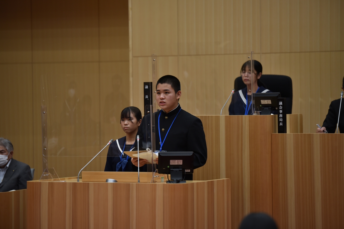 市内中学校3校の3年生17名の「子ども議員」が登壇し、人吉市が直面するさまざまな課題やまちづくりについて一般質問を行いました。