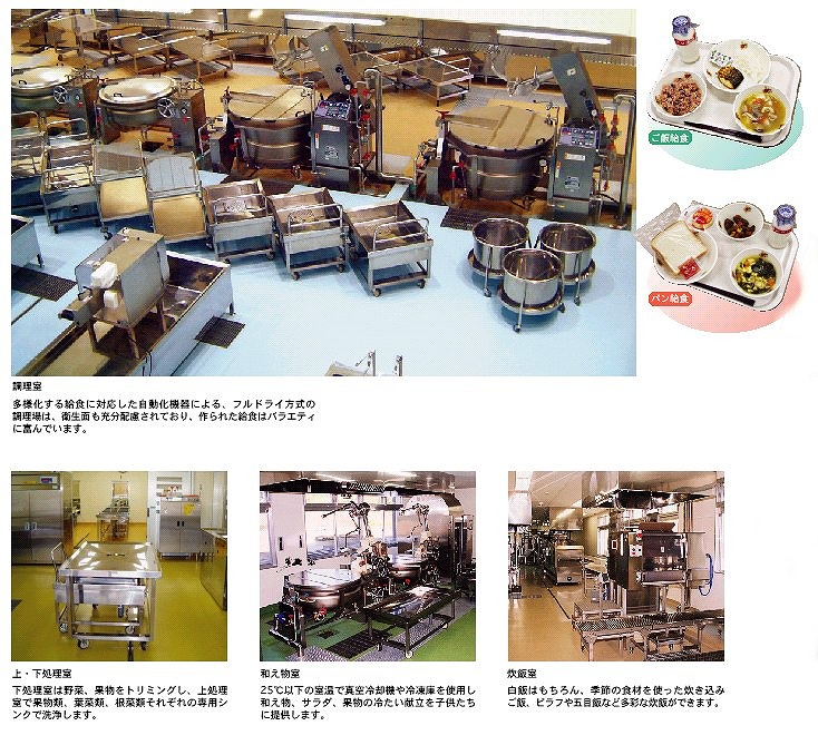 - 1階 事務室、検収室、上下処理室、調理室、和え物室、炊飯室、コンテナプール、洗浄室、残菜処理室、ボイラー室