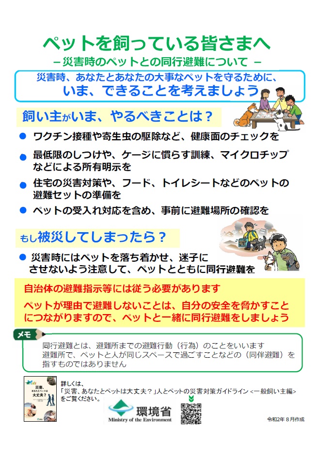 環境省から次のとおりお知らせがありましたので、今一度ペットとの避難についてご確認をお願いします。