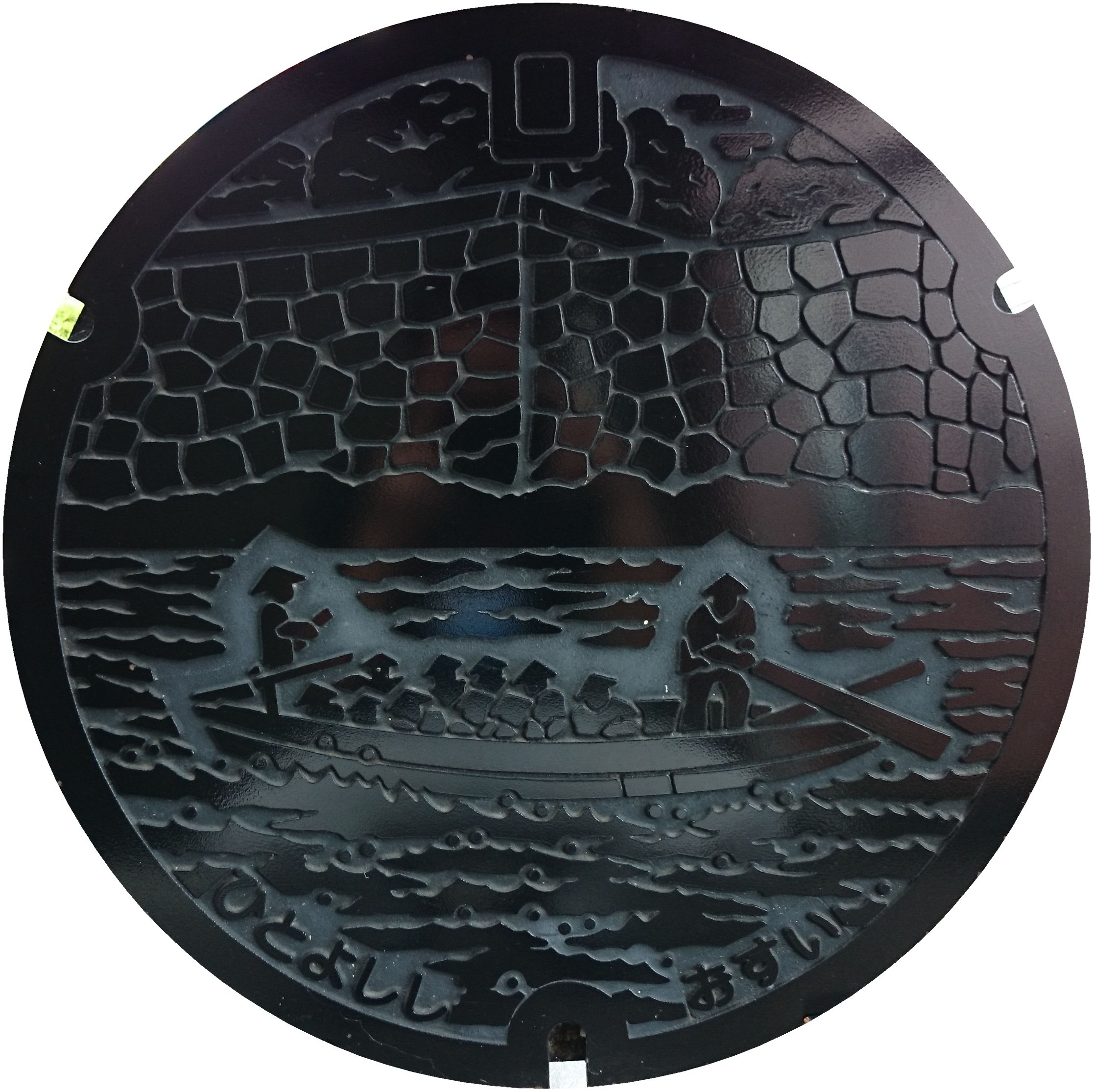 直径600ミリメートル。主に歩道用として採用だが、以前は車道にも採用していた。くま川下りと人吉城跡をモチーフにしたデザイン。