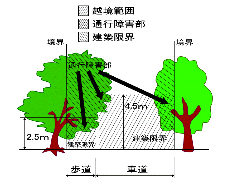 道路を安全に通行するため、一定の幅及び高さの範囲内に通行の障害となるものを設けてはならない区域として、建築限界が定められておりますので、下図の通行障害部の伐採をお願いいたします。