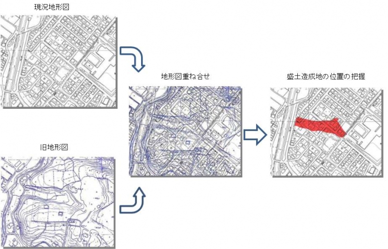 宅地造成前後の新旧の地形図などを重ね合わせて、造成により地盤が高くなっているところを探し、大規模盛土造成地の2つの定義に該当する箇所を抽出しています。