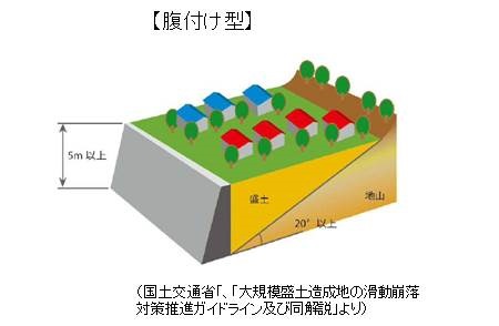 傾斜地に盛土した宅地で盛土する前の地山の傾斜が20度以上で、かつ、盛土の高さが5m以上の盛土造成地