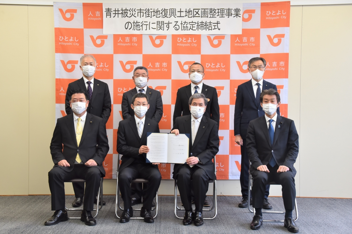 令和4年3月27日(日曜日)に、熊本県及び人吉市による「青井被災市街地復興土地区画整理事業の施行に関する協定締結式」が行われました。