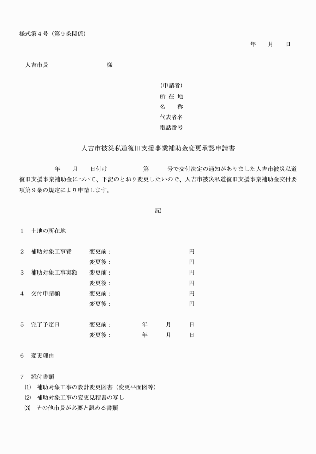 第9条 交付予定者は、補助対象工事の内容を変更し、又は補助対象工事を中止し、若しくは廃止しようとするときは、人吉市被災私道復旧支援事業補助金変更承認申請書(様式第4号)に市長が必要と認める書類を添えて市長に提出し、その承認を受けなければならない。
