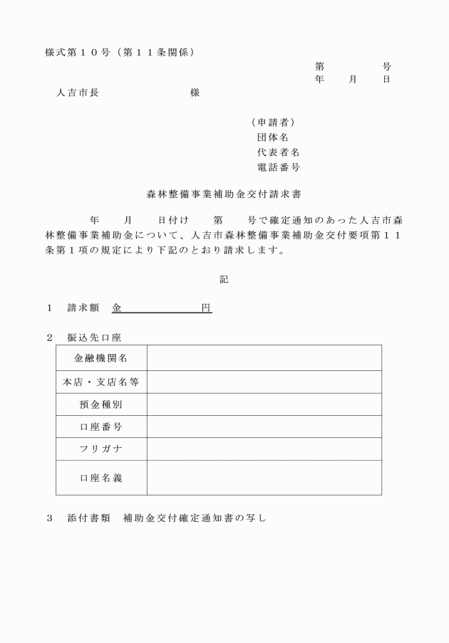 実績報告 | 1 事業実績書(様式第2号) 2 収支精算書(様式第3号) 3 森林環境保全直接支援事業等の補助対象であることが確認できる書類の写し 4 下刈作業に従事した作業員の名簿及び下刈手当の支給要件が明記された雇用契約書等の写し 5 作業員への下刈手当支払を証する書類の写し | |