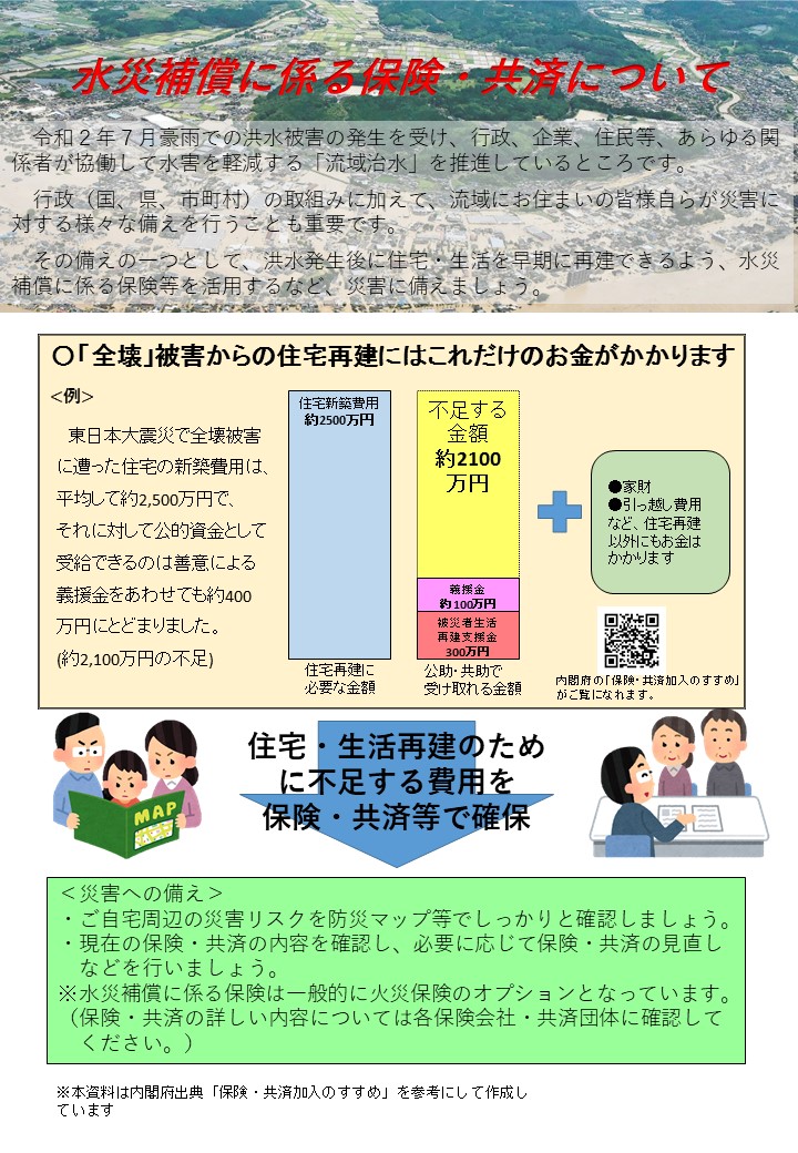 行政の支援に加え、自らの備えとして水災補償のある保険などを活用しましょう。